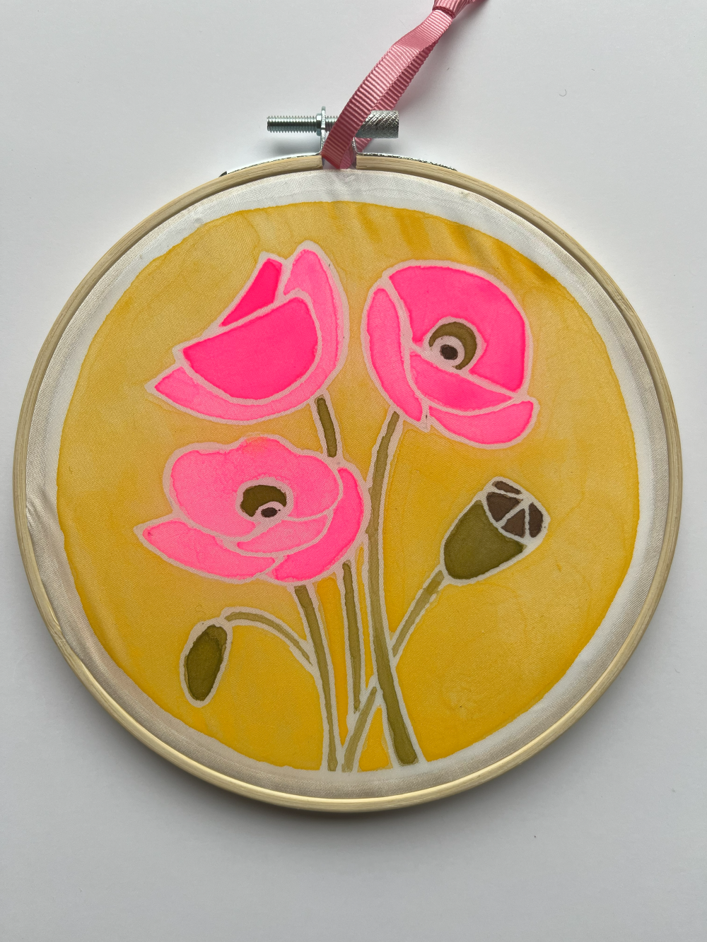 • votre tableau sur soie prêt à être accroché ou appliqué sur un textile de votre choix,