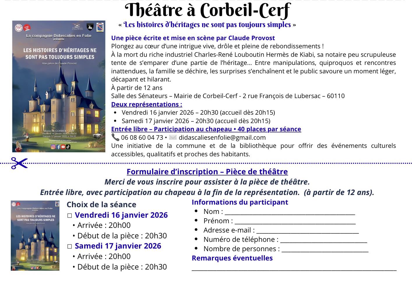 #Théâtre #CorbeilCerf #LaCorbeilAuxLivres #Bibliothèque #CulturePourTous #Spectacle #ComédieThéâtrale #ÉvénementCulturel #Oise #VieLocale #LectureEtCulture #SortirDansLOise #ThéâtreAmateur #DidascaliesEnFolie